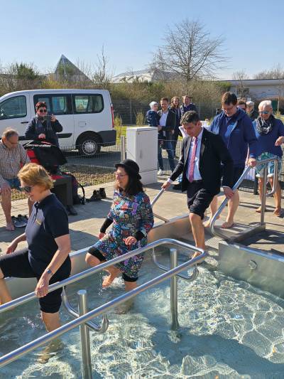 v.l.n.r.: Bürgermeister Michael Hultsch, Barbara Klepsch (Sächsische Staatsministerin für Kultur und Tourismus), Annett Kozak (Geschäftsführerin BBK), Landrat Henry GraichenAm sonnigen Samstagmorgen, dem 22. März 2025, um 10:00 Uhr, versammelten sich schon viele Menschen hinter dem Riff-Resort Bad Lausick bzw. vor dem neuen Kneippbecken. Dessen Zertifizierung brachte die Sächsische Staatsministerin für Kultur und Tourismus, Barbara Klepsch mit. Sie konnte das Prädikat „Kneippkurort“ dem stolzen Bürgermeister Michael Hultsch pünktlich zum Saisonstart überreichen und freute sich mit dem anwesenden Landrat Henry Graichen und der Geschäftsführerin der BBK Bad Lausicker Bauorganisations-, Betriebs- und Kur GmbH, Annett Kozak, über das Alleinstellungsmerkmal Bad Lausicks, zwei Kurprädikate innezuhaben. Vor drei Jahren erlangte die Kursstadt das Prädikat des Thermalbades und konnte dies nun noch mit dem Prädikat Kneippkurort krönen. „Das ist in Sachsen einmalig“ so Barbara Klepsch. Es ist ein wunderbares Geschenk auch anlässlich des 30-jährigen Riff-Geburtstages. Die Voraussetzungen ein Kneippkurort zu sein, setzt die fünf Säulen nach Kneipp voraus: Wasser, Ernährung, Balance, Pflanzen und Bewegung. Letztere kann gleich im anliegenden Trimm-Dich-Pfad getestet werden. Der Förderverein des Kur- und Freizeitbades Riff hatte rund um das kleine aber feine Event für die gesunde Ernährung und den warmen Tee gesorgt, den die anwesenden Gäste dankend annahmen, nachdem sie im Storchengang im kalten Wasser des Kneippbeckens eine Runde absolvierten. Landrat Graichen ließ in seiner Ansprache schon einen kleinen Blick in die Zukunft zu und berichtete, dass Bad Lausick ein Gradierwerk sowie ein Kulturmittelhaus aus den Strukturwandelmitteln errichten möchte.