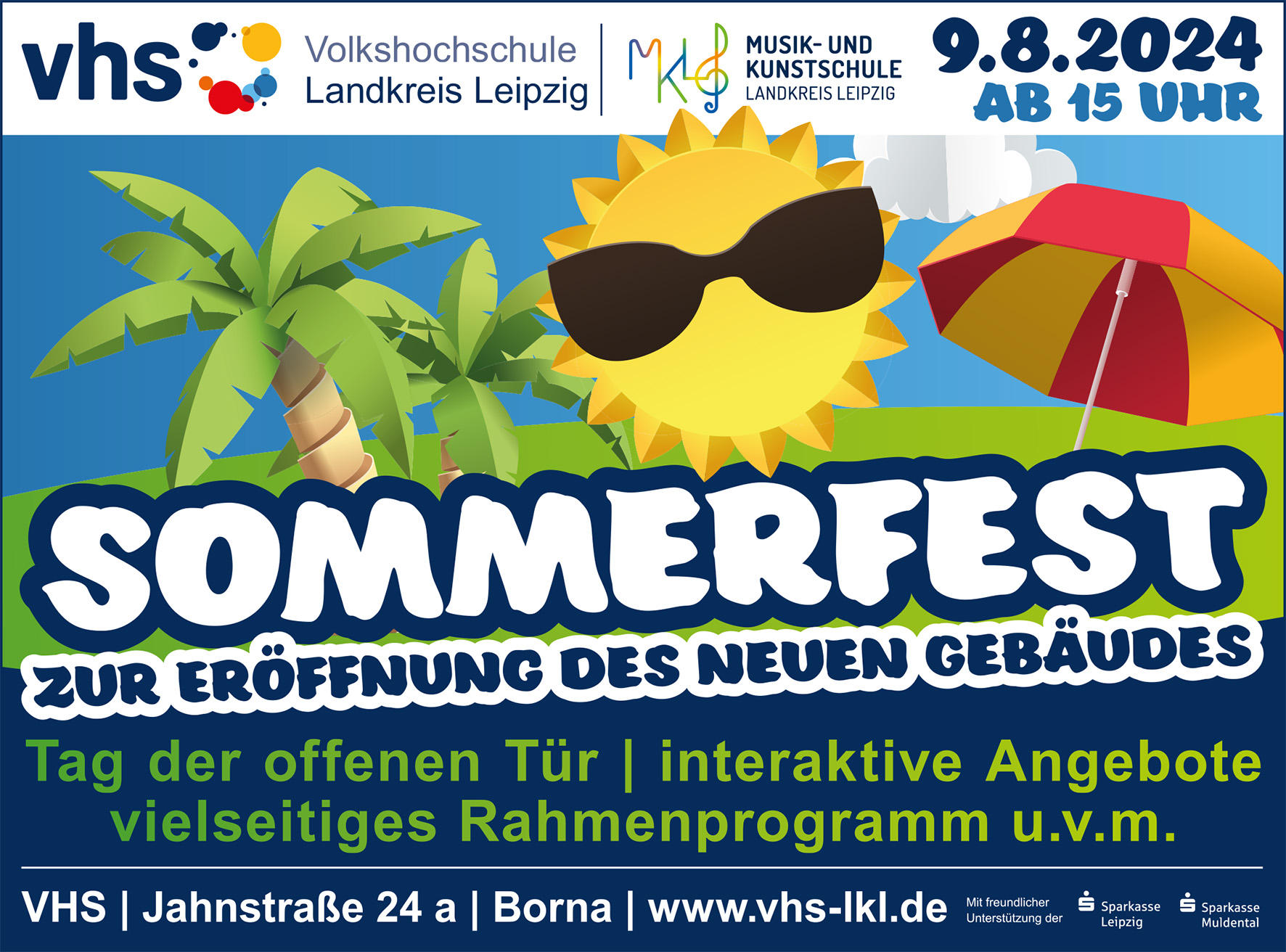 Nach fast zweijährigen, umfangreichen Bauarbeiten wurden die räumlichen Kapazitäten des Kommunalen Eigenbetriebs für Bildung und Kultur des Landkreises Leipzig mit seinen Betriebszweigen Volkshochschule sowie Musik- und Kunstschule erheblich vergrößert und modernisiert. Am 9. August 2024 wird in der Jahnstraße 24a in Borna die offizielle Eröffnung gefeiert. Beginn ist um 15:00 Uhr mit Kaffee und Kuchen. Zur Einweihung wird gegen 15:30 Uhr der Präsident des Sächsischen Volkshochschulverbandes, Ministerpräsident Michael Kretschmer, erwartet.