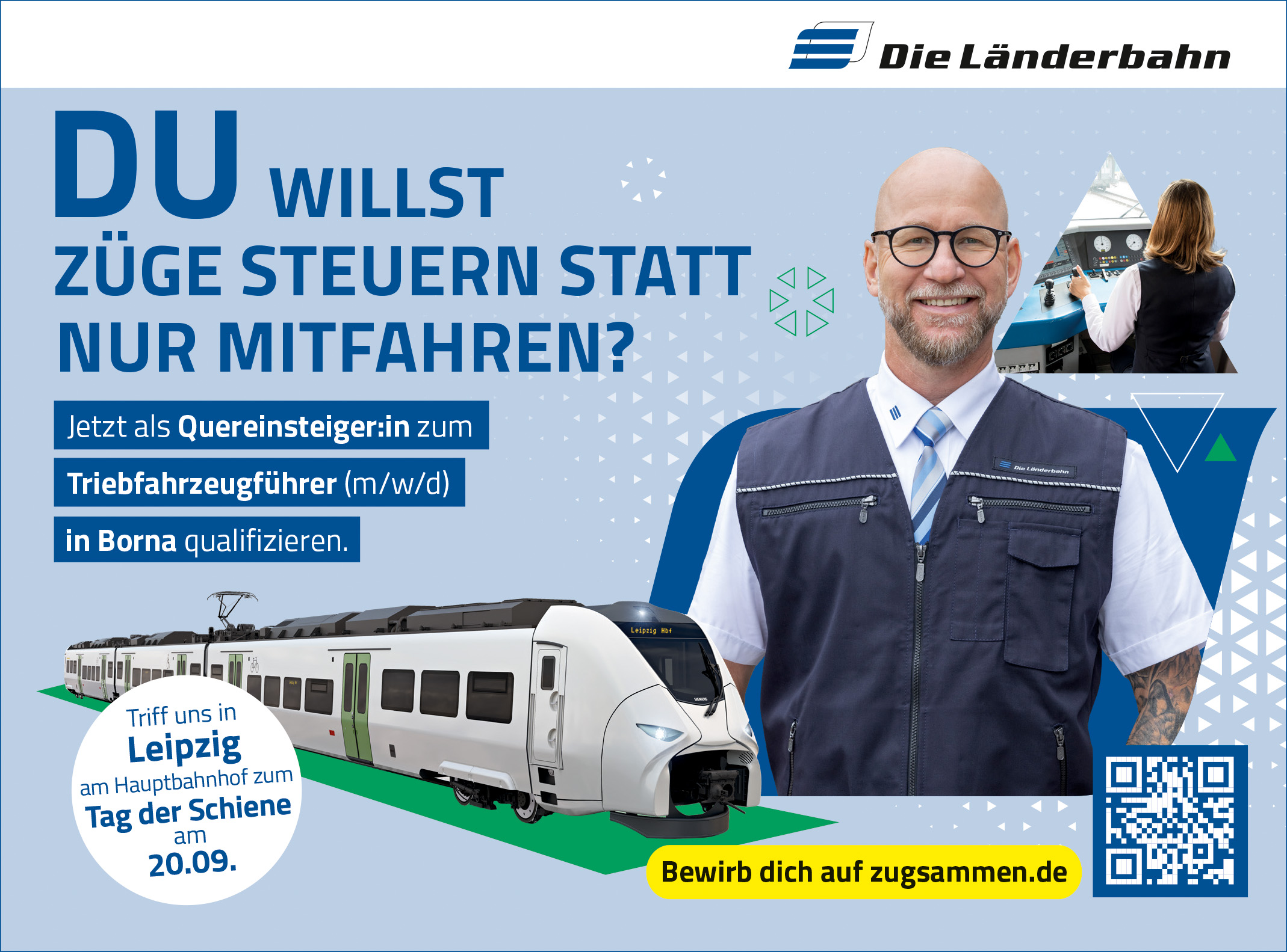 In Borna entsteht eine von insgesamt sieben neuen Einsatzstellen. Dafür ist die Länderbahn auf der Suche nach Personal. Auch Branchenfremde haben jetzt die Möglichkeit, einen beruflichen Neuanfang zu wagen. Die Länderbahn bietet den Quereinstieg in die Bahnbranche an. Die Qualifizierungen zur Triebfahrzeugführerin bzw. zum Triebfahrzeugführer dauern insgesamt neun Monate, davon mindestens drei Monate Praxisschulung im Führerstand. Noch bis März kommenden Jahres werden Qualifizierungen angeboten. Qualifizierungen zum Zugbegleitpersonal starten ab März 2026 und dauern jeweils zwei Monate. Gehalt gibt es vom ersten Tag der Qualifizierung. Nach erfolgreichem Abschluss erfolgt nahtlos die unbefristete Anstellung im Unternehmen.