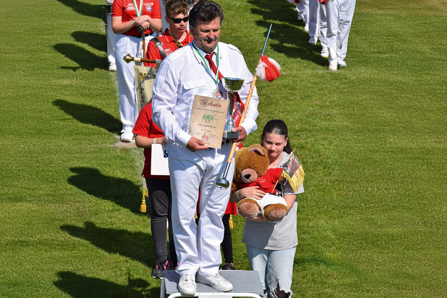 Unsere jungen Mitglieder, also heute unsere Löwenbande, die noch nicht aktiv an Meisterschaften teilnehmen, tragen bei der Eröffnung und beim Abschluss eines Wettkampfes den „Markklee Bär“ in der ersten Reihe neben dem Stabführer auf den Wettkampfplatz. Auch zur Siegerehrung dürfen sie mit nach vorne. So wird unser Nachwuchs gleich mit eingebunden. Einige längst erwachsene Mitglieder können sich noch gut daran erinnern…