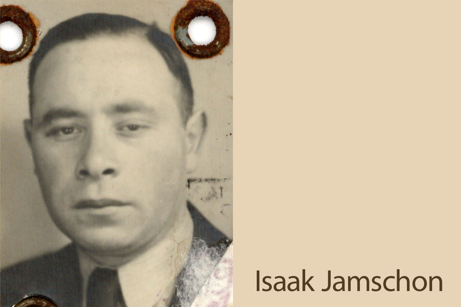 Isaak Jamschon wurde am 1. Mai 1907 im russischen Pskov als Sohn jüdischer Eltern geboren. Sein Vater war der Kaufmann Berko Jamschon und seine Mutter Leja Jamschon, geborene Schwat. Die Schwester von Isaak Jamschon war die am 1. Dezember 1920 in Leipzig geborene Rosa Jamschon. Er ging einer Tätigkeit als Lagerist nach. Bis zu seiner Flucht nach Belgien im Jahr 1939 wohnte er in der Leipziger Seeburgstraße 26. Lucie Berliner (Markkleeberg) bemühte sich vehement um eine Ausreise für sich und ihre Familie aus dem Deutschen Reich. Da Isaak Jamschon und dessen Familie auf Grund ihrer Staatenlosigkeit Ende Juni des Jahres 1939 des Deutschen Reiches verwiesen wurden und er keine Aufenthaltsgenehmigung erhielt, war die einzige Option, am 10. August 1939 nach Belgien zu fliehen, wo er die Avenue Fonsny 23a in Saint Gilles, Brüssel, bewohnte. Laut Akten des Sächsischen Staatsarchivs Leipzig erreichte Issak Jamschon am 19. August 1939 Belgien. Dort bemühte er sich um Visa für seine Verlobte ,Lucie Berliner, und deren Familie. Bis zu seiner Ausweisung wartete er auf eine Vorladung beim Amerikanischen Konsul in Leipzig, da ursprünglich geplant war, in die USA auszuwandern. Gemeinsam mit Rosa und Friedrich Berliner folgte ihm Lucie Berliner im Dezember 1939 nach Belgien. Während der Flucht wurden Rosa und Friedrich in Sicherheitshaft genommen. Lucie Berliner war sich allerdings im Unklaren darüber, ob sie sich ebenfalls einer Verhaftung unterziehen müsse, da sie als Grund des Aufenthalts in Belgien die Hochzeit mit ihrem Verlobten Isaak Jamschon, der ein belgisches Visum besaß, angab. Aus einem Brief, den Rosa Berliner nach der Inhaftierung im Internierungslager schrieb, geht hervor, dass Lucie das Verlassen des Lagers für kurze Zeit gestattet wurde, um in Saint Gilles Isaak Jamschon am 24. April 1940 zu heiraten. Kurze Zeit später, am 10. Mai 1940, begann die deutsche Wehrmacht mit der Invasion der Benelux- Staaten. Danach erfolgte eine sofortige Rückkehr von Lucie Jamschon in das Lager, während es Isaak Jamschon weiterhin gewährt war, in Brüssel zu leben. Am 3. August 1942 wurde Isaak Jamschon zur Arbeit einberufen und kam in das SS-Sammellager in Mechelen. Am 11. August 1942 wurde er von Mechelen nach Auschwitz- Birkenau deportiert. Nach seiner Ankunft in Auschwitz- Birkenau erfolgte nach der Selektion die Einweisung von Isaak Jamschon zur Zwangsarbeit im Konzentrationslager. Sein Name erscheint in den Sterbebüchern von Auschwitz-Birkenau mit dem Datum 11. September 1942.