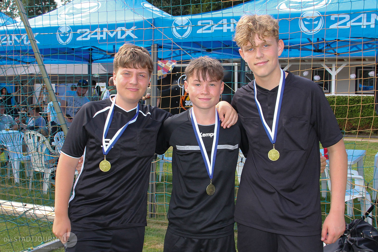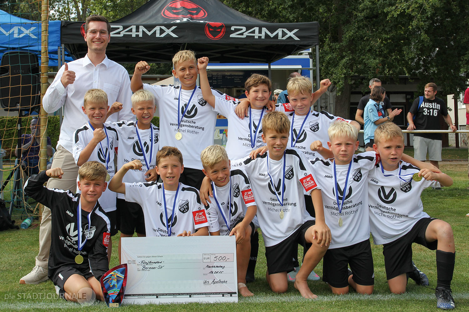 Doch der Reihe nach: Am heißesten Tag vor dem Event wurden die Vorbereitungen durch unseren Präsidenten Mario Braun mit seinen fleißigen Helfern, Freunden und einigen Mitgliedern der Abteilung Fußball durchgeführt. Die Plätze wurden gekreidet, bewässert und die Tore aufgebaut. Weiterhin wurden neun Pavillons aufgestellt und somit für 60 schattige Sitzplätze gesorgt. Eine Möglichkeit zum Abkühlen für unsere kleinen Sportler wurde geschaffen und natürlich musste auch noch die Essens- und Getränke-Meile aufgebaut werden.