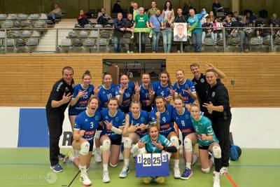 Nur eine Woche später wartete auf die Markkleebergerinnen mit dem BBSC Berlin der Zwölfte der Vorsaison. Die Hauptstädterinnen hatten ihr erstes Spiel ebenfalls verloren und wollten nun ihr erstes Heimspiel gegen die Aufsteigerinnen erfolgreich gestalten. Doch das Markkleeberger Team hatte etwas dagegen und gewann, angetrieben und bejubelt von mitgereisten Fans, seine ersten drei Punkte in der „neuen” Liga. Das sah zu Beginn des ersten Satzes noch nicht so aus, denn man lag schnell zurück. Doch nach der zweiten Auszeit beim Stand von 9:14 wendete sich das Blatt und unsere Damen fanden zu ihrem Spiel. Sie gewannen den Satz mit 25:21. Der zweite Satz verlief ähnlich wie der erste. Trotz einer Markkleeberger Aufholjagd ging er mit 20:25 verloren. Den dritten Satz gestalteten unsere Volleys überlegen, hatten in fast allen, oft umkämpften Situationen die bessere Lösung und gewannen ihn mit 25:16 klar. Der vierte Satz begann ähnlich, doch die Berlinerinnen hielten noch einmal dagegen, konnten den Markkleeberger Satzgewinn aber letztlich nicht mehr verhindern. Team und Fans bejubelten einen 3:1-Auswärtssieg nach 101 Spielminuten.
