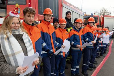 Als Dank für die stimmungsvolle Darbietung spendierten der Globus Baumarkt und der Nikolaus kleine Präsente, Glühwein und Bratwurst. Zudem durfte sich die Kinder- und Jugendfeuerwehr über den Wetteinsatz freuen: als Spende in Höhe von 350 Euro.