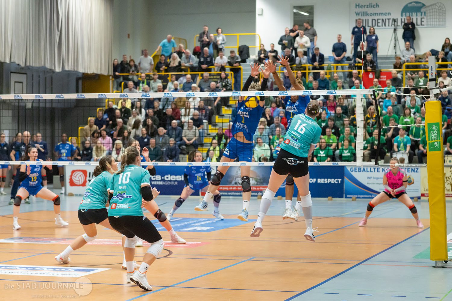 Das wollten auch die 274 Fans und trieben unsere Mädels durch die wieder prächtige Stimmung dazu permanent an. Leider war das aber nicht von Erfolg gekrönt, weil die Gäste aus der Landeshauptstadt einfach zu stark aufspielten. Training an 5 Tagen je Woche, z.T. mit den DSC-Profis, und die physischen Vorteile – das sind Dinge, die nur schwer zu kompensieren sind. Und doch haben sie auch Spiele in der lfd. Saison verloren, sind also nicht unschlagbar. Und vielleicht wäre ohne den krankheitsbedingten Ausfall unserer Stammzuspielerin Bianca (ihr gute Besserung und Linda Anerkennung, denn sie hat m.E. ihre Sache im ersten Spiel über die volle Zeit sehr gut gemacht) unsere Gegenwehr auch etwas stärker ausgefallen, im zweiten Satz kamen die Mädels mal in den nötigen Flow und schon war der Satzgewinn sehr, sehr nahe, schade, dass sie sich da nicht belohnt haben. Aber auch hier der Reihe nach: