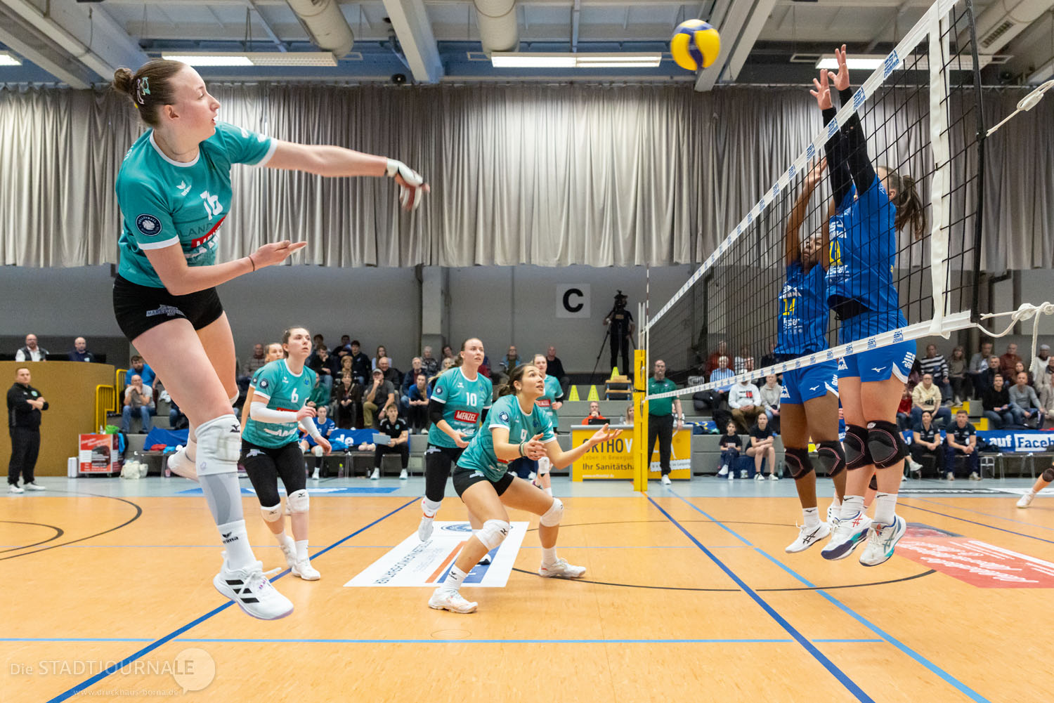 Und die Gäste hielten, was der Trainer sich von ihnen versprach, so dass die wieder mehr als 200 Fans in der Halle insgesamt das erwartete Spiel auf Augenhöhe von Tabellennachbarn zu sehen bekamen, das phasenweise für unsere Mädels auf der Kippe stand. Doch die Fans wollten natürlich mit dem Team drei Punkte feiern und machten generell, aber in den für uns kritischen Phasen des Spiels umso mehr, Stimmung in der Halle. Aber der Reihe nach: