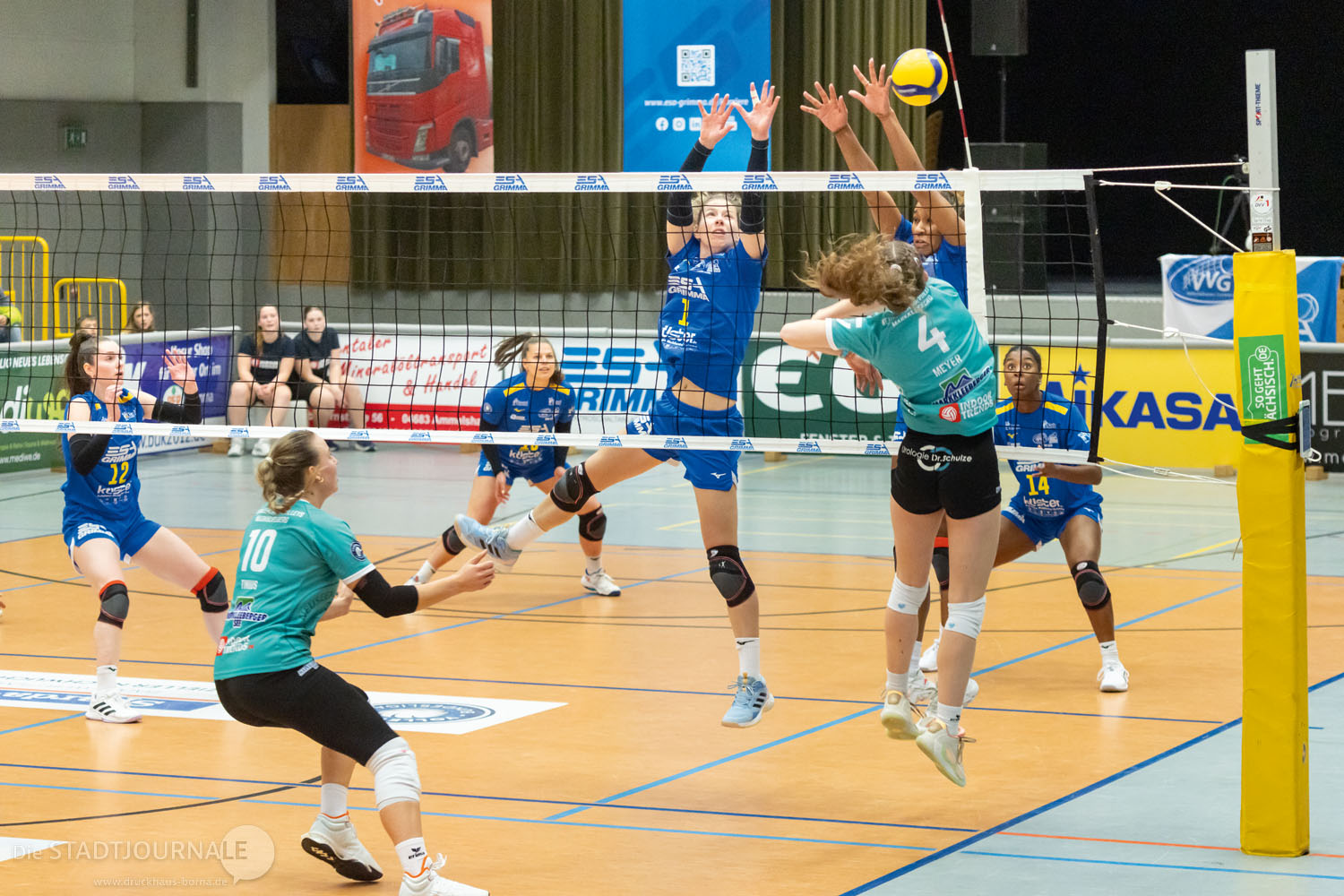 Der als Tabellenneunter favorisierte „Nachbar“ wollte natürlich den Auswärtssieg im November 2025 wiederholen und drei weitere Ligapunkte auf seinem Konto verbuchen. Aber der Grimmaer Vorsprung in der Tabelle war auf zehn Punkte „geschmolzen“, weil man sich zuletzt doch ein paar unerwartete Punktverluste geleistet hatte (jeweils 1:3 daheim gegen Leverkusen und in Oythe). Möglicherweise ergab sich daraus ja der Ansatz, die insoweit vielleicht ein wenig verunsicherten Grimmaer Volleys von Beginn an unter Druck zu setzen und mutig den eigenen Erfolg zu suchen.