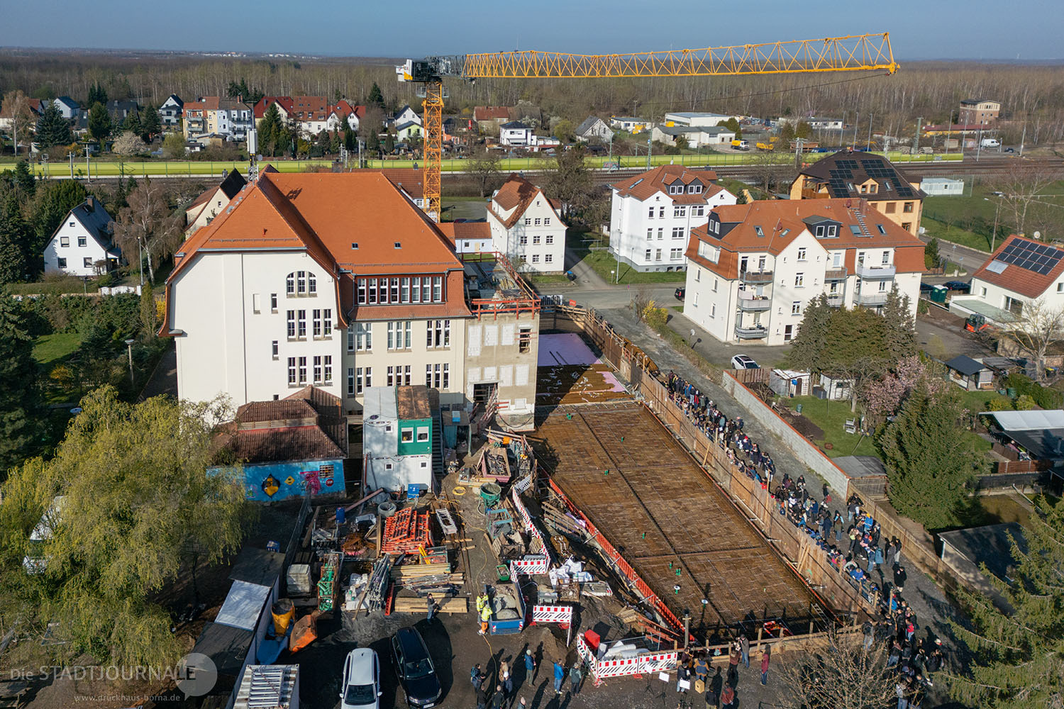 Die feierliche Grundsteinlegung für den Großdeubener Schulneubau fand bei sonnigem Wetter am Gründonnerstag, dem 2. April 2026, nach der Osterandacht in der Großdeubener Katharinenkirche in Anwesenheit aller Schülerinnen und Schüler, Lehrerinnen und Lehrer sowie des Vorstands des Schulvereins Lernwelten e. V. statt. Die Veranstaltung markierte einen wichtigen Meilenstein für die Zukunft des evangelischen Gymnasiums „Lernwelten“.