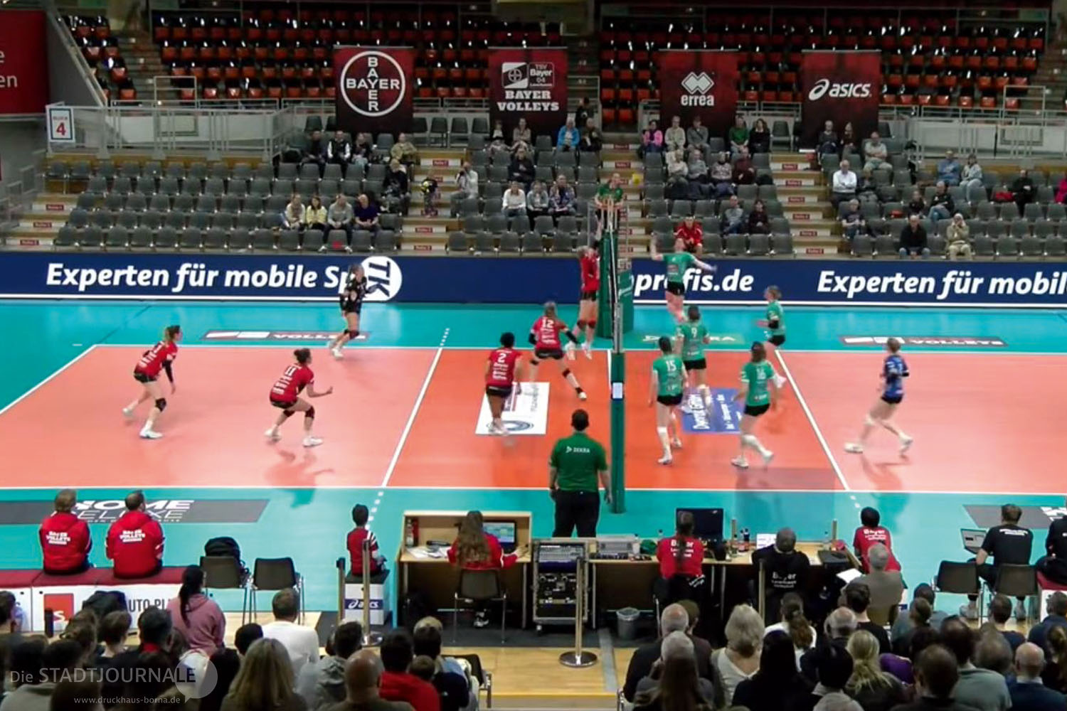 Trainer Tim Reichenbach beschrieb die Aufgabe u.a. so: „… steht mit Leverkusen ein wirklich schwerer Gegner vor unserer Brust. Das erfahrene und erneut sehr physisch starke Team hat uns bereits im Hinspiel vor große Herausforderungen gestellt. Hoffen wir, dass wir diesmal unsere Stärken im Aufschlag und in der Feldabwehr aufs Parkett bringen können, um dem dominanten Leverkusener Angriffsspiel etwas entgegenzusetzen.“ Das gelang vor allem in den ersten beiden Sätzen sehr gut und wurde da m.E. durch eine sehr erfolgreiche Blockarbeit ergänzt.