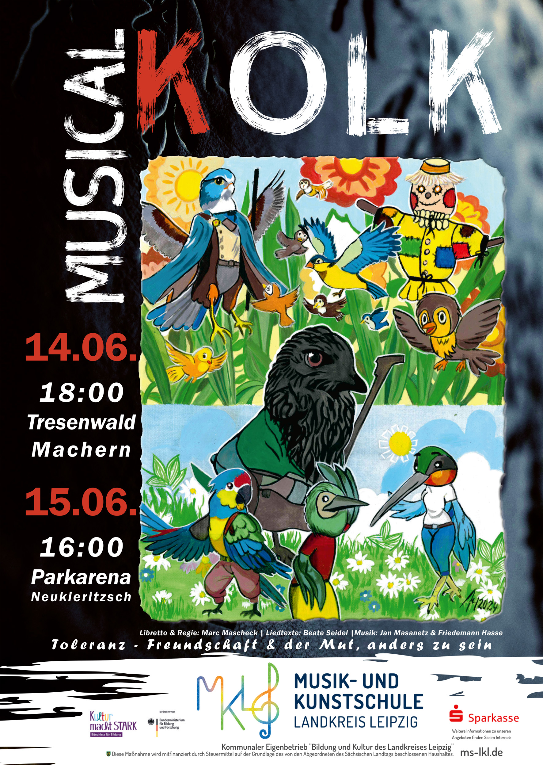 Was „Kolk“ so besonders macht: Das gesamte Musical – von der Idee über Musik und Texte bis hin zu Choreografie, Kostümen und Bühnenbild – wurde von Schülern und Lehrkräften der Musik- und Kunstschule selbst entwickelt. Mehr als 160 Jugendliche aus dem Landkreis sind als Sänger, Tänzer, Darsteller oder als junge Musiker im Orchester zu erleben. Kostüme und Bühnenbild wurden in einer Kooperation mit dem Kinderhaus „Tim Täumel“ in Borna und den Kostümbildnern des TheatreFragile aus Berlin von Kindern und Jugendlichen selbst hergestellt. Die Musical-Produktion ist das Ergebnis monatelanger gemeinschaftlicher Arbeit, kreativer Prozesse und großer Leidenschaft für Musik und Theater.