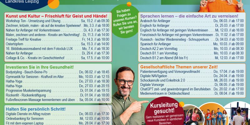 Der Februar bringt Veränderungen mit sich. Der Winter wird vertrieben und die ersten Sonnenstrahlen wecken die Natur aus dem Winterschlaf. Nutzen Sie diese Energie und lassen Sie sich von unserem abwechslungsreichen Kursangebot inspirieren. Die VHS Landkreis Leipzig bietet Ihnen die Mögl...
