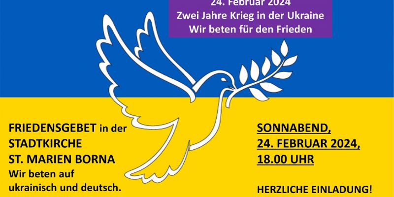 Vor zwei Jahren begann der Krieg in der Ukraine. In Borna findet am Samstag, 24. Februar 2024, 18:00 Uhr ein Friedensgebet in der Stadtkirche St. Marien statt. Das Gebet wird von der Ev.-Lutherischen Emmauskirchgemeinde Bornaer Land zusammen mit Menschen aus der Ukraine gestaltet.